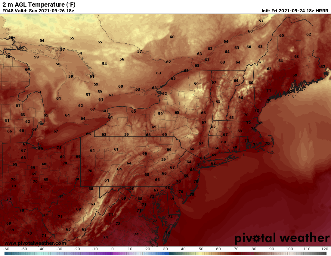 HRRR Forecast Temperatures - 2 PM Sunday - Courtesy Pivotal Weather
